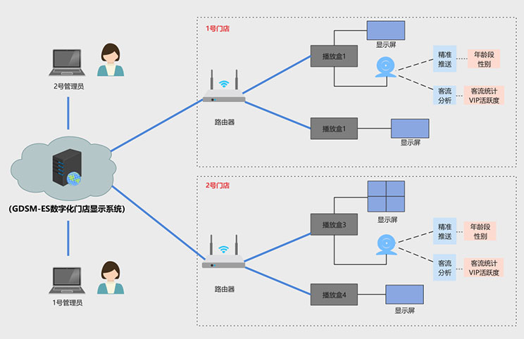 该客户为宁波地区零售门店,在一段时间内,客户发现门店销售额持续下滑,但是不知道原因出在哪里,到底是消费者减少,还是广告推送出现问题,亦或是其他原因,客户没有头绪,非凡游戏平台科技数据化门店显示系统完美的解决了客户痛点,方案拓扑图如下: