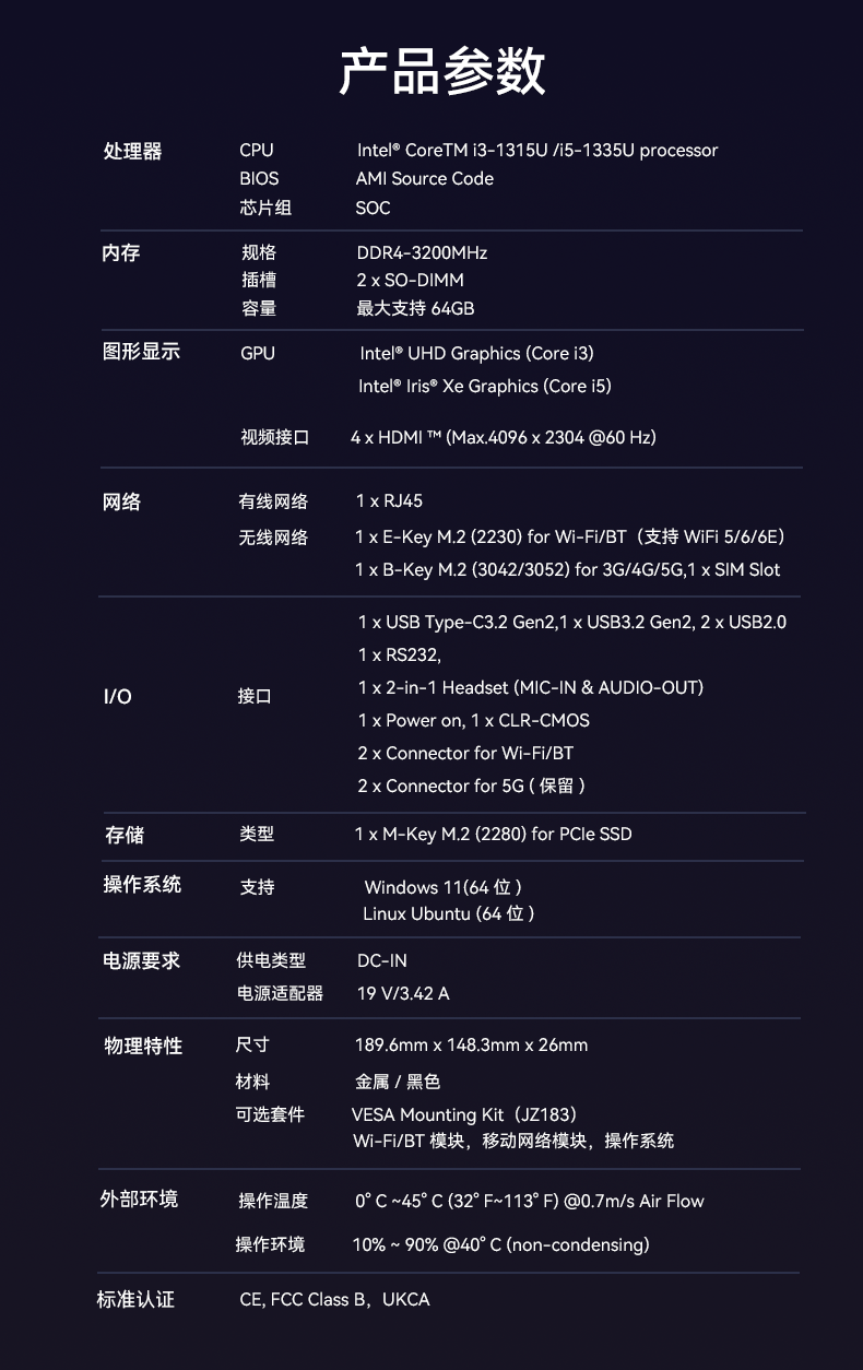 非凡游戏平台科技D613采用英特尔Raptor Lake酷睿i3-1315U/i5-1335U 处理器,作为一款性能强悍的主机,它的TDP仅15W,能有效降低能耗,延长电池寿命。在内存方面,D613采用2 x SO-DIMM DDR4-3200 MHz,最大可达64GB,并配备1 x M-Key M.2 (2280) for PCIe SSD。
