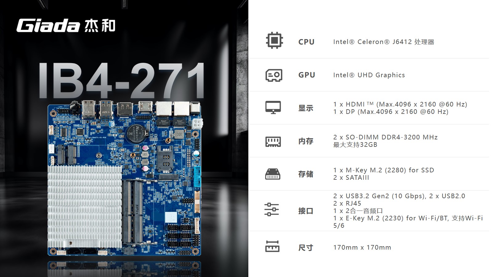 支持4K@60fps H.265/ H.264/ VP9/ VP8视频解码,支持多路视频源同时解码,支持1 x HDMI支持4K视频输出,1 x LVDS,1 x VGA(coly eDP),实现多屏异显,支持千兆自适应RJ45网口,板载Wi-Fi/BT模块,可广泛应用于物联网网关、边缘存储、工控平板、工业检测、工控盒等行业定制市场。
