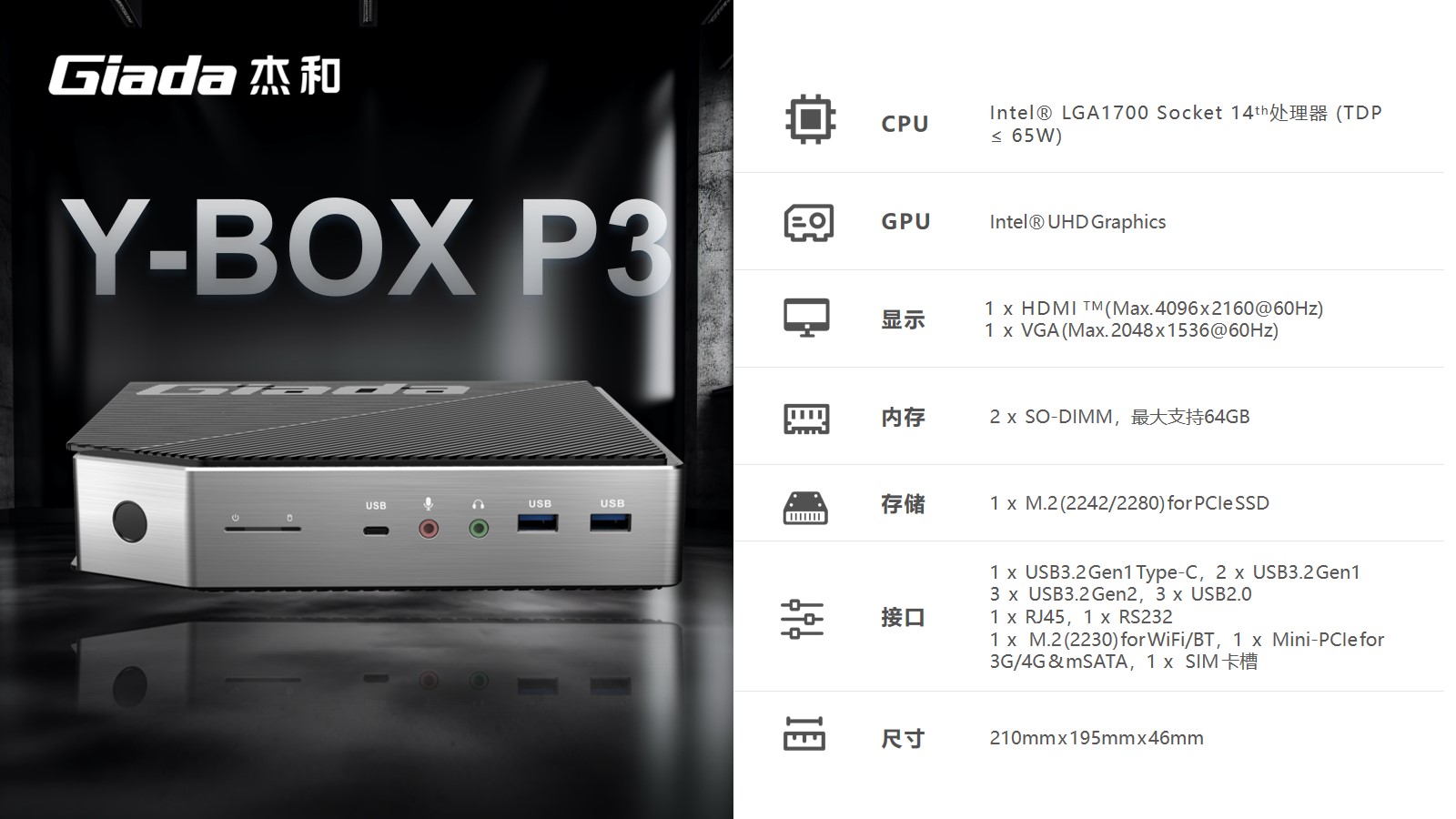 支持指纹解锁,支持type-c接口,支持PD协议的27W快充。非凡游戏平台科技最新云终端Y-BOX P3采用Intel® LGA 1700 Socket CPU插槽设计,支持intel 12~14代酷睿系列处理器,配备i7-14700处理器,20核28线程,最大睿频频率为5.4GHz,处理器基础功耗 65W。采用双通道笔记本内存槽设计,最大支持容量可达64GB,最高支持DDR5-5600MHz频率,比 DDR4 至高标准数据速度 3200MT/S多传输 1.75 倍。