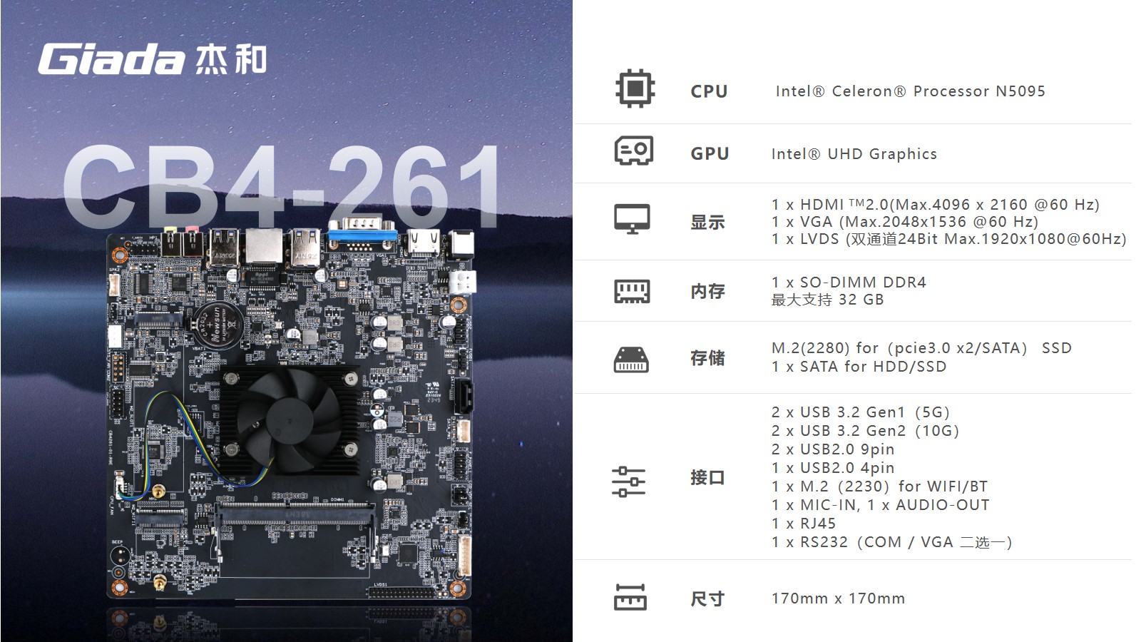 非凡游戏平台科技CB4-261尺寸仅有170x170mm,小而精巧。搭载N5095芯片,该芯片采用10nm制程技术,四核心设计,支持Windows 、Linux系统,可满足多种终端机应用场景的需求,如信息查询、基本数据处理等。