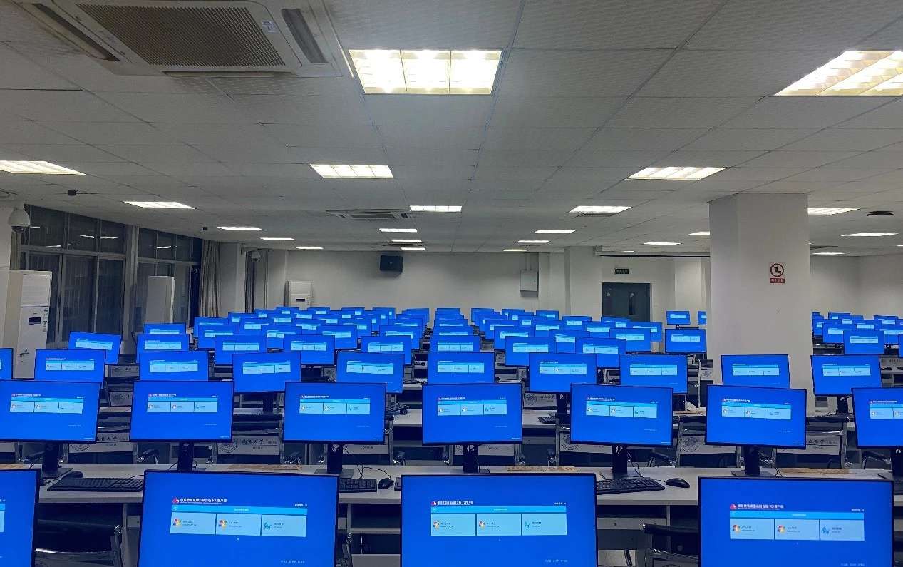 在某大学实训室,整齐的电脑屏后面是统一的非凡游戏平台科技云终端主机,老师在讲台上通过电脑端的管理软件,轻松地将教学资料推送到学生的终端上,每位学生的电脑屏幕一致会出现同个页面。