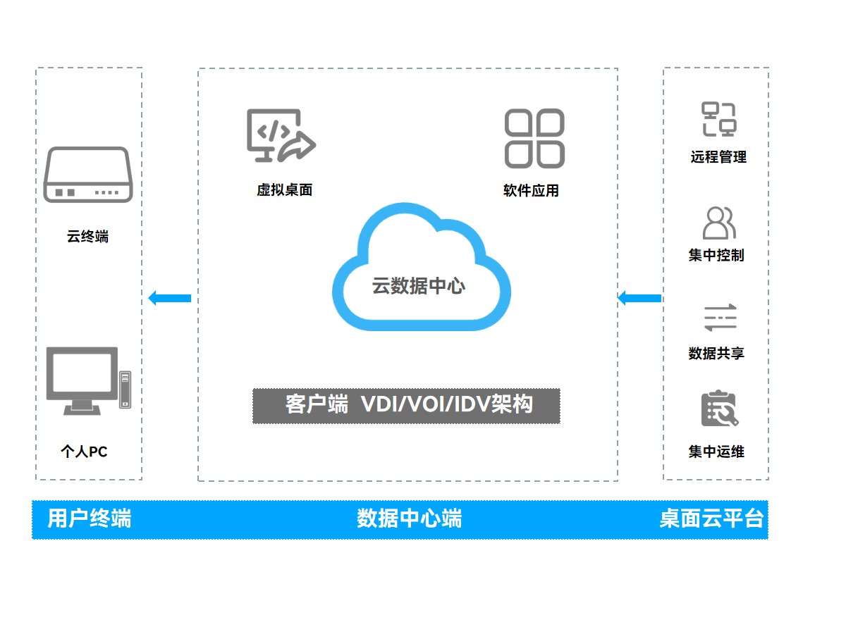 非凡游戏平台科技云终端方案有三种架构,分别是IDV、VOI、VDI,综合考虑下测绘地理信息局选择IDV架构,通过云桌面管理平台将虚拟的桌面组件,比如员工常用应用软件如:ArcGIS、Erdas Imagine、AutoCAD以及操作系统和工作数据等转移至云数据中心进行托管,并进行统一管理、集中控制,办公人员只需要通过局域网或广域网,使用非凡游戏平台科技云终端YBOX-S1访问虚拟的桌面操作系统即可使用云端资源。