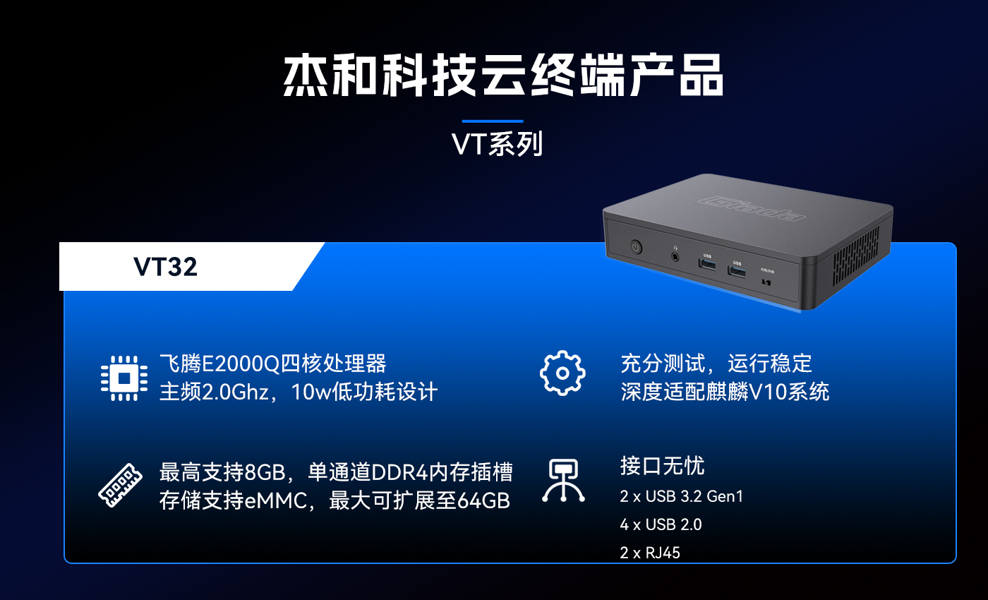 为响应信创趋势,非凡游戏平台科技推出了搭载国产芯片—飞腾E2000Q的云终端VT32,VT32与麒麟V10操作系统进行了深度适配,为用户打造出更加安全可信的解决方案。