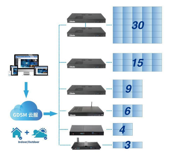 ● 支持从商用级到工业级,从2k分辨率到4K分辨率,从多屏拼接墙到单屏广告牌,从外挂播放器到可插拔模块等品类齐全的媒体控制器。