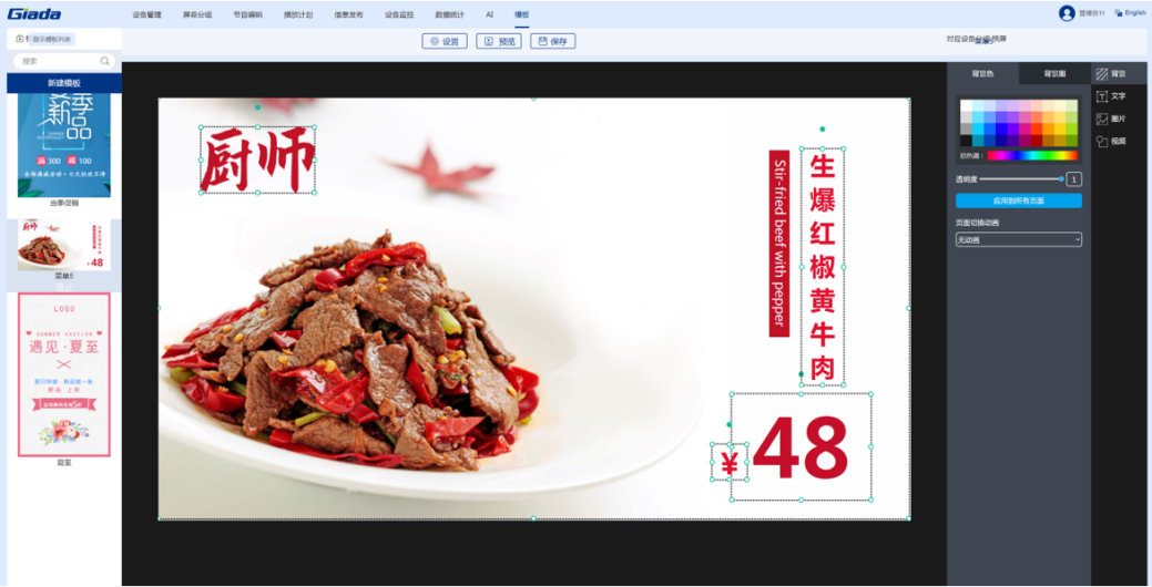 非凡游戏平台科技智慧餐厅综合解决方案是由智能零售管理系统搭载公司自研的数字标牌播放器组成的软硬件一体化方案。该系统针对餐厅、酒店等不同行业提供典型节目模板,支持手机、电脑建议操作。用户只需3步即可完成节目的制作播放:选择节目模板,更换自己的素材(视频、图片和文字),预览保存及播放。价格、优惠折扣等信息可随时更改。