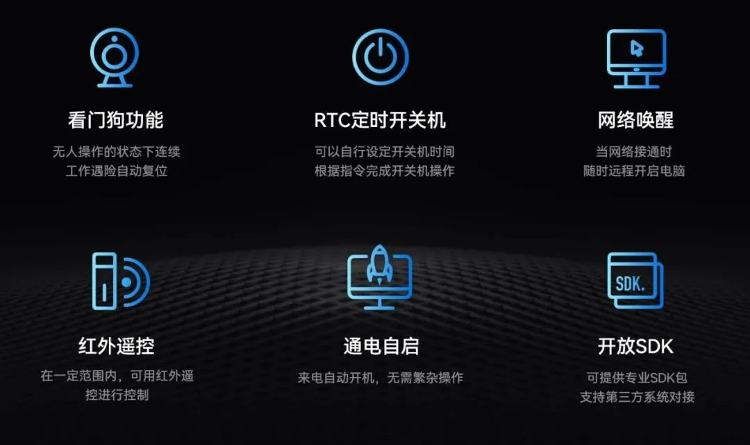 非凡游戏平台主板IB3-771配置了无人值守专利技术,大力降低因高算力带来的能源消耗,该技术通过定时开关机、看门狗计时器、RTC宕机自检、红外遥控和局域网唤醒等功能实现主板绿色运行。