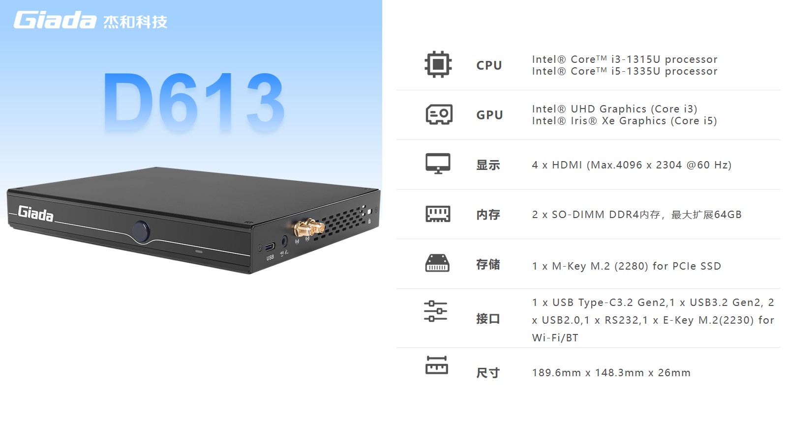 非凡游戏平台数字标牌D613搭载Intel RaptorLake Corei3-1315U/i5-1335U处理器,可以同时连接4个4K显示器,支持4K分辨率编码解码,还支持5G蜂窝网络,速度比4G LTE快10倍。