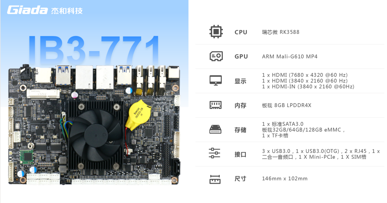 非凡游戏平台主板IB3-771搭载瑞芯微RK3588八核64位处理器,内置6TOPS算力的NPU,具备高算力、内存大、超强多媒体、多重扩展等技术优势。满足8k超高清视频的显示需求,还支持主流深度学习框架,为各类 AIOT 应用场景提供更优的性能表现,支持机器人、边缘计算、智能NVR、智能汽车、智慧大屏、AR/VR、智能自助终端场景的广泛应用。
