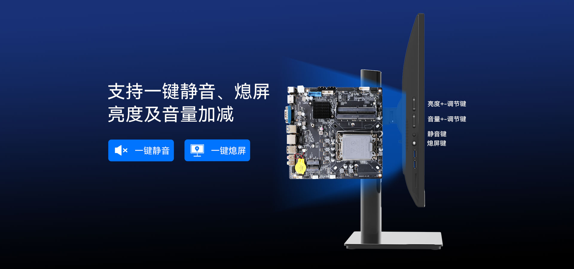 支持硬件一键静音、一键熄屏、音量加减、亮度加减